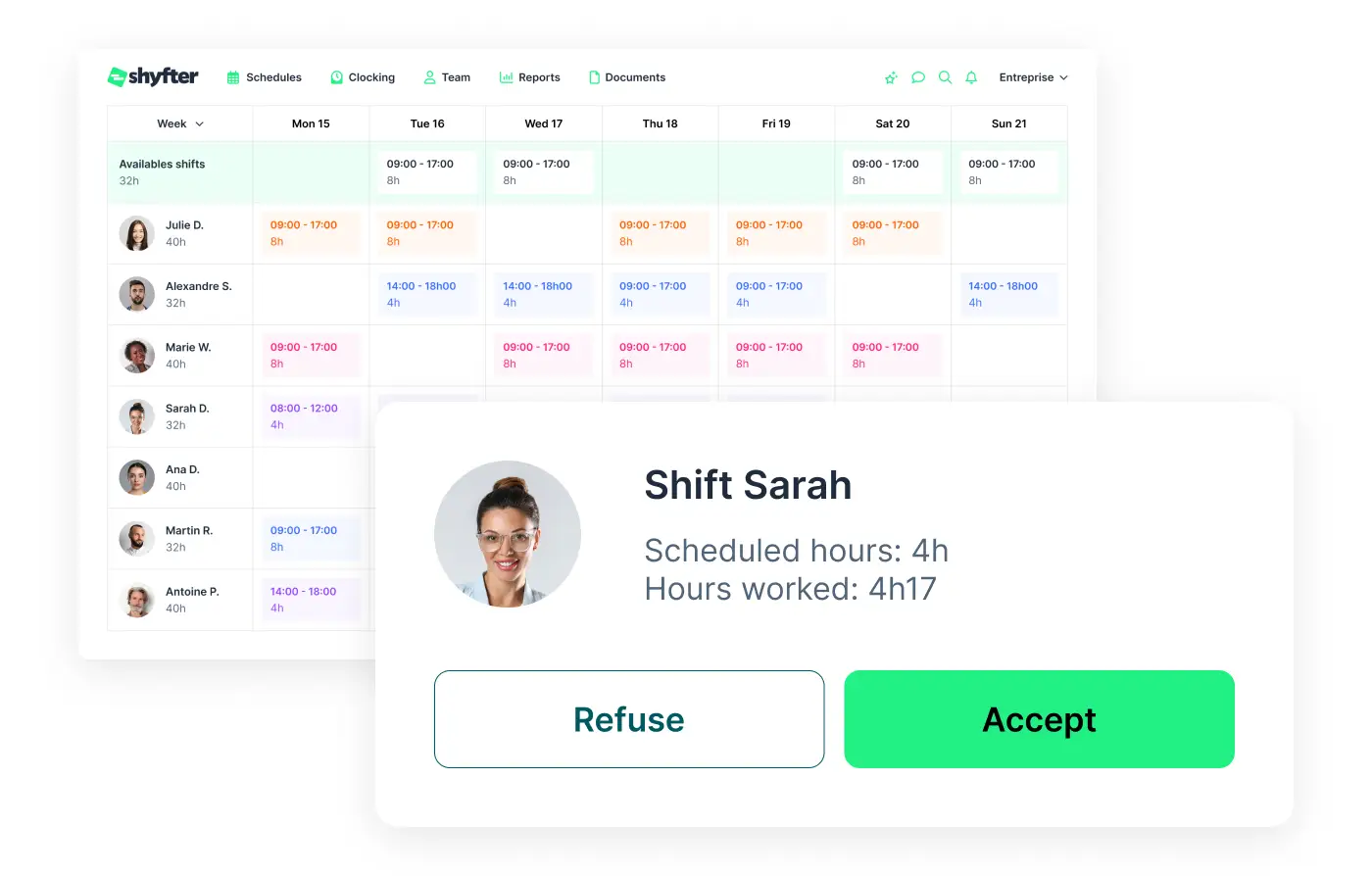 Shyfter automatically merges scheduled hours with actual clocked hours. This gives you a consolidated and clear view of your business activity on a single interface.