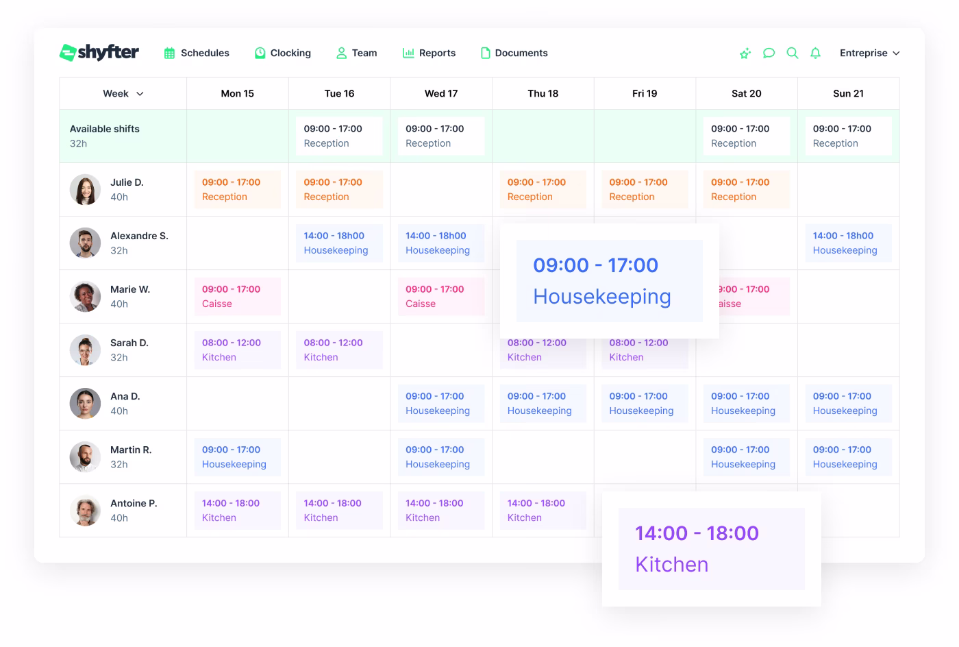 Track worked hours across your teams, whether they work in rooms, at reception, or in the dining room.