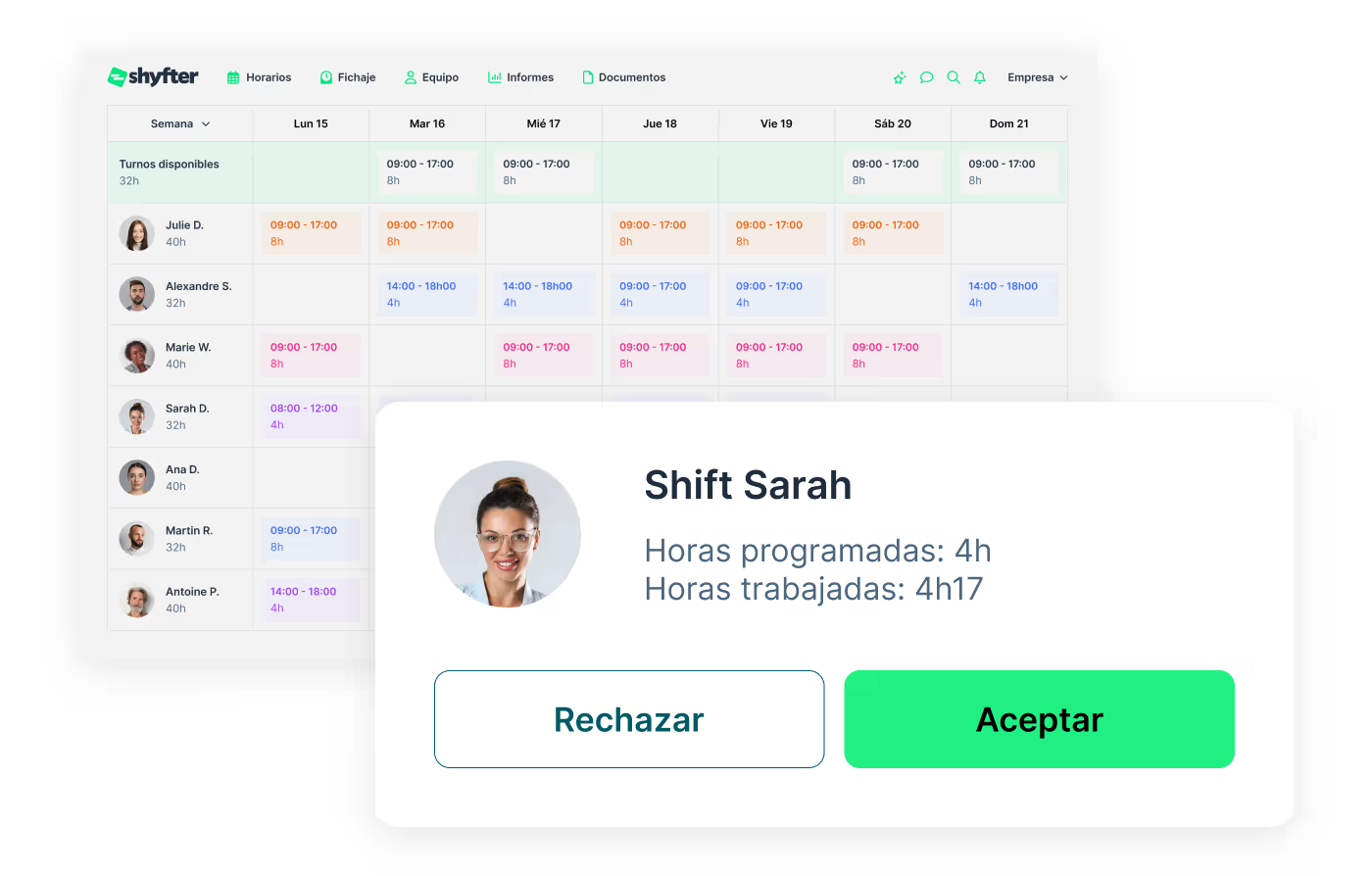 Shyfter agrupa automáticamente las horas previstas en el cuadrante y las horas reales registradas en el fichaje. Así, obtienes una visión consolidada y clara de la actividad de tu empresa en una sola interfaz.