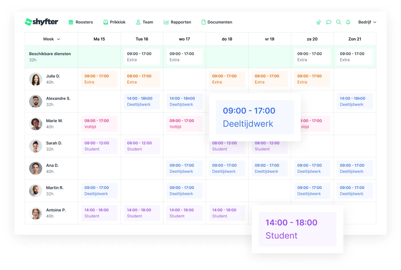 Beheer eenvoudig grote teams, uitgebreide openingstijden en wisselende behoeften op basis van drukte en seizoenen.